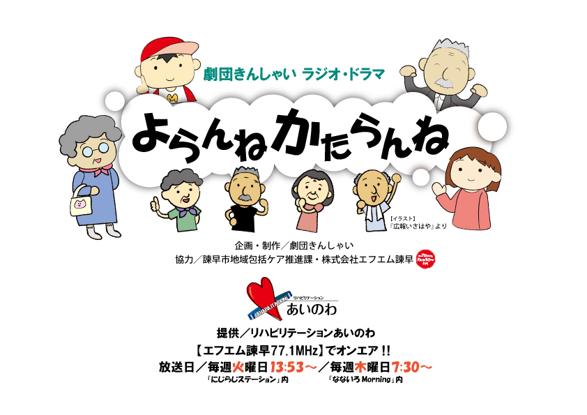 | 放送日時:毎週土曜日18:00〜18:15 アシスタント:河野律子 番組提供:社会福祉法人南高愛隣会 【番組内容】 地域に元気を。 同じ空の下、みんな生きている。みんなが生きている。地域に暮らす一人として、活気に満ちた地域づくりに貢献します。 |